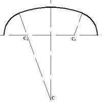 El trazado geométrico de la puerta es de un arco carpanel, está formado por tres arcos de circunferencia, su ejecución se aprecia a la derecha. Son dos arcos menores de centro C1 y C2, y uno central de mayor radio de centro C que enlaza con los menores. En la puerta, de igual modo que en el dibujo explicativo de la derecha, la luz se ha dividido en 4 partes iguales y los centros C1 y C2 se sitúan en la línea de arranque. En el caso del arco central su centro se encuentra en la base de la puerta.