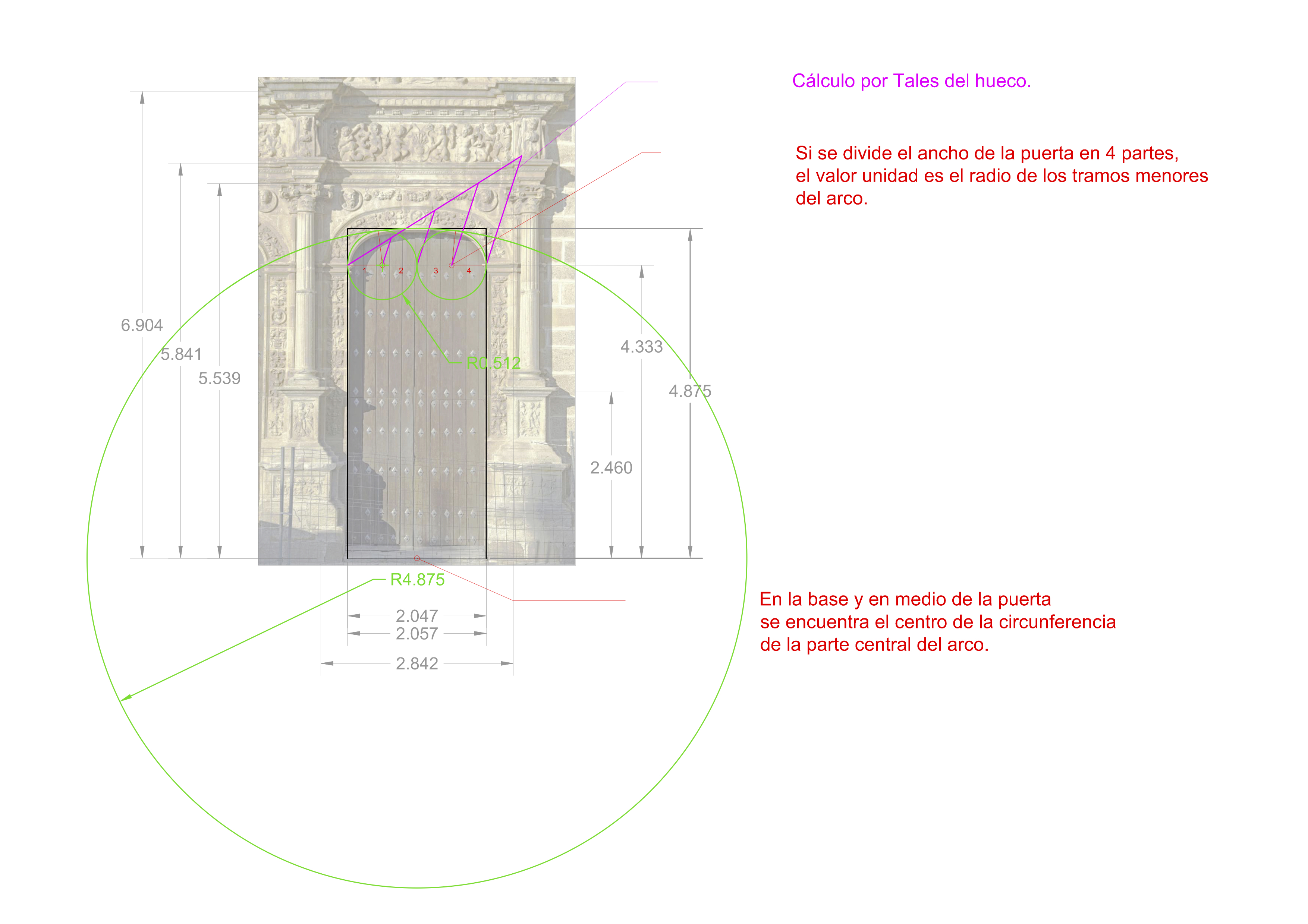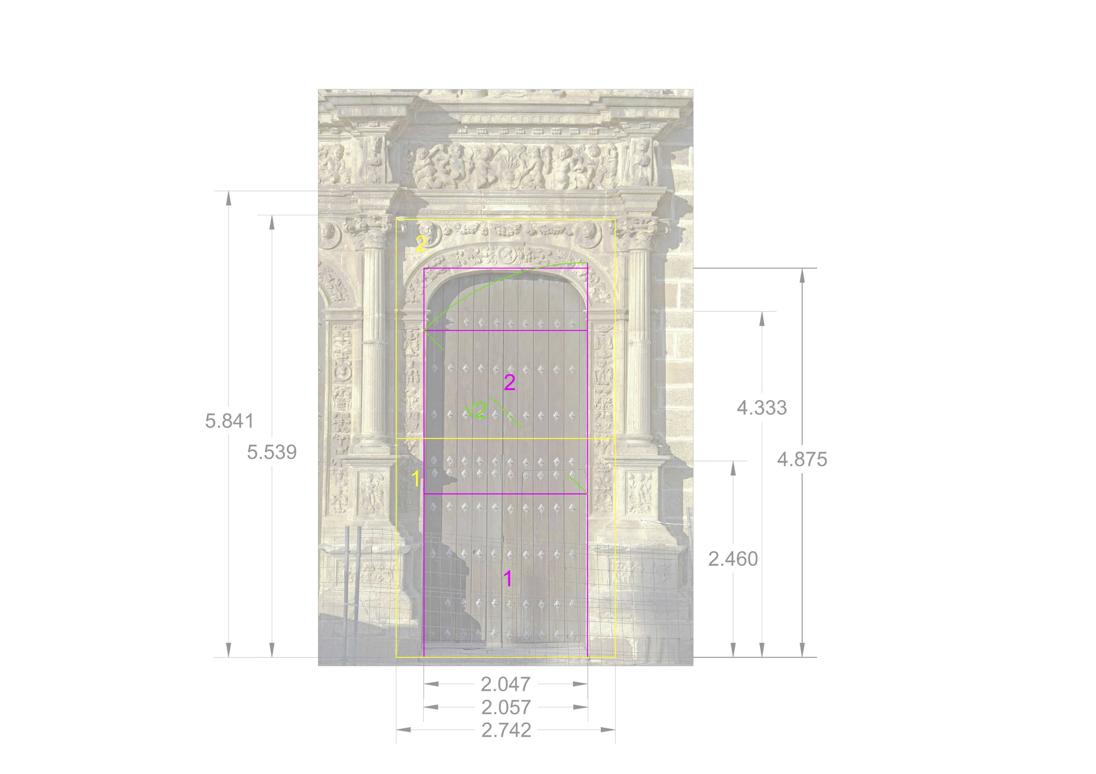 Si nos centramos en el portado, espacio inferior entre columnas, se aprecia que el patrón de composición es de 2 cuadrados superpuestos (amarillo). En el caso de la puerta es un cuadrado al que le superpone un rectángulo raiz de 2 (magenta y verde) aún sin concretar con más precisión.
