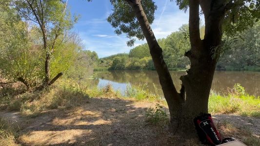 Desde el Charco de Moro en el río Alagón, la chopera del fondo perfila el camino del Rincón del Obispo, pedanía de la ciudad de Coria. Por la mañana desde las 11.30 a 14:30 o incluso hasta las 15:00 y por supuesto, hacía bastante calor, de tamaño 56 x 76 cm. Buen sitio para darse un baño.
