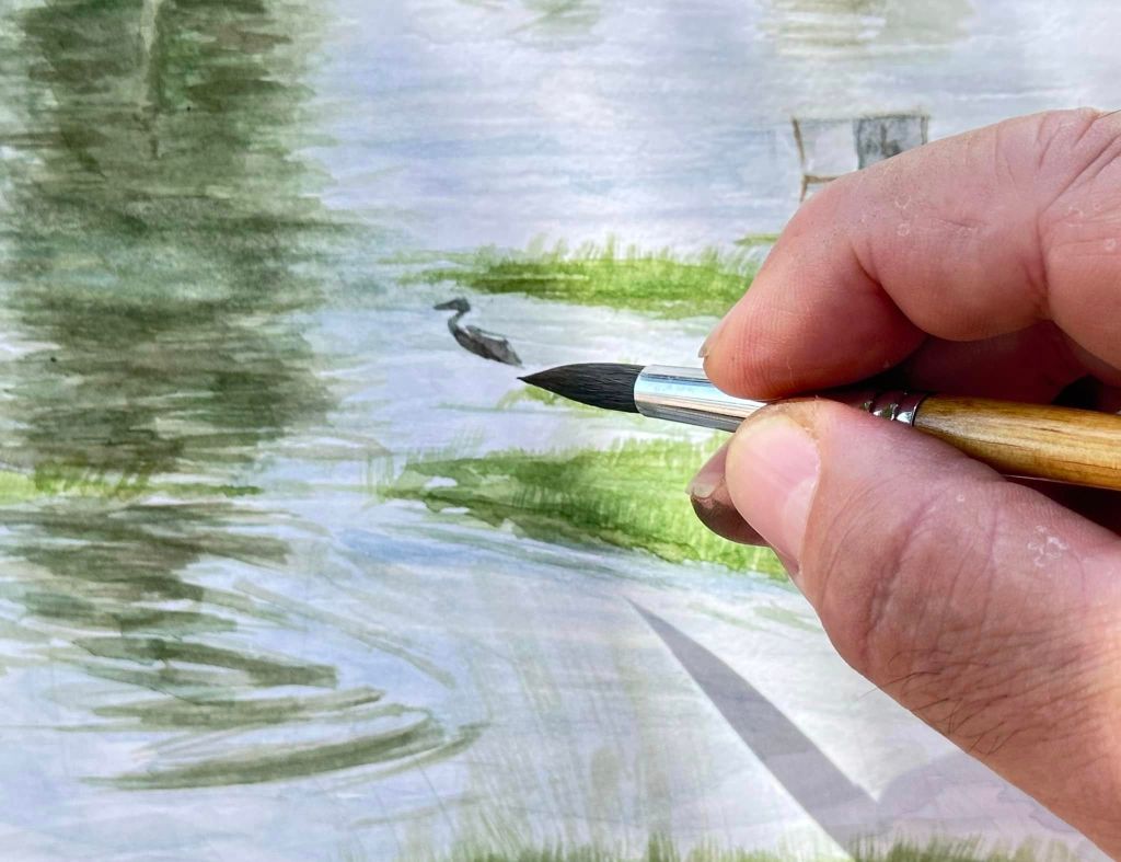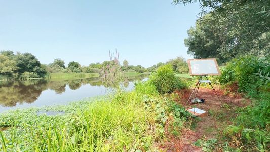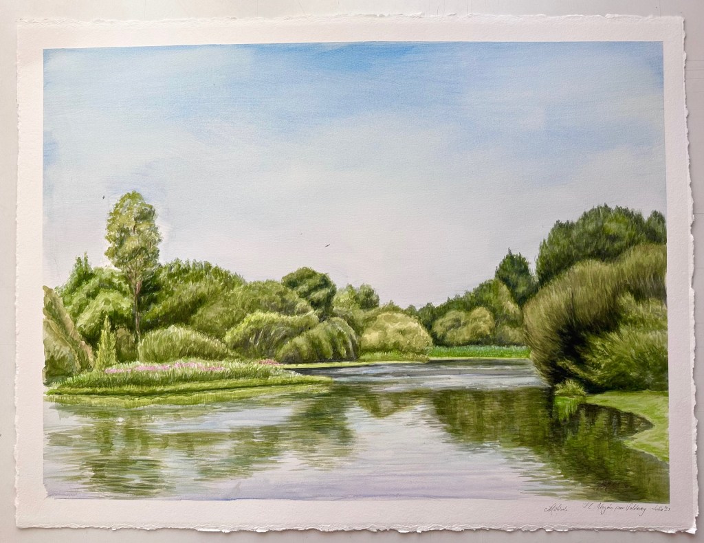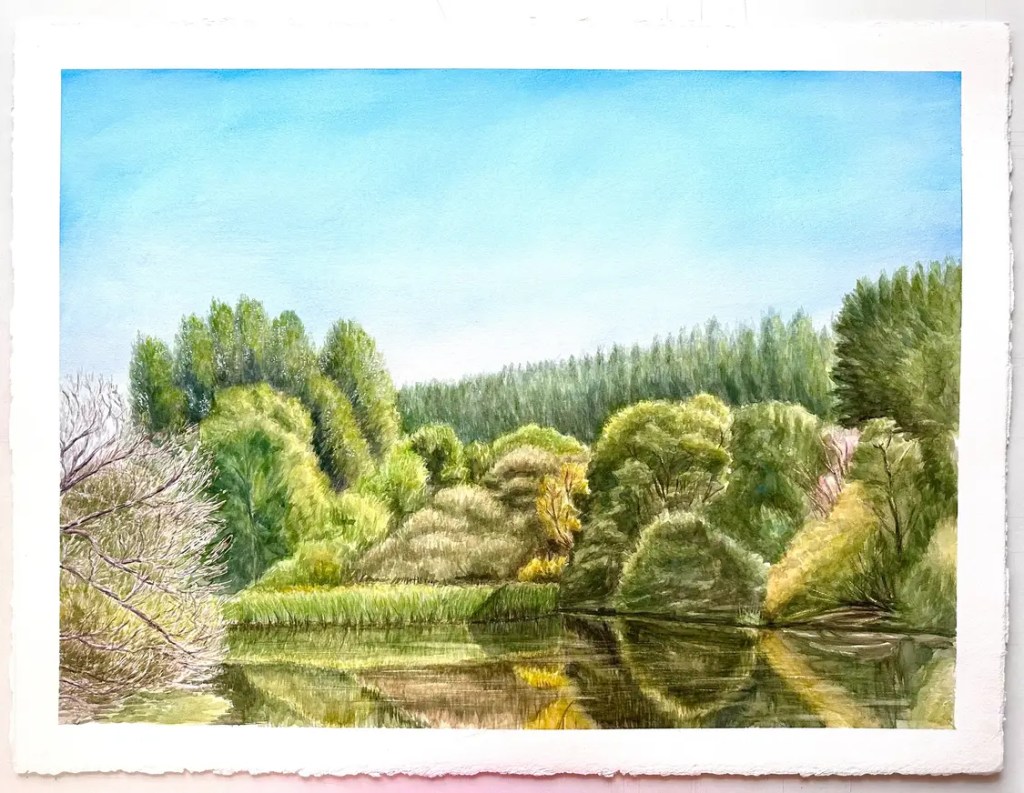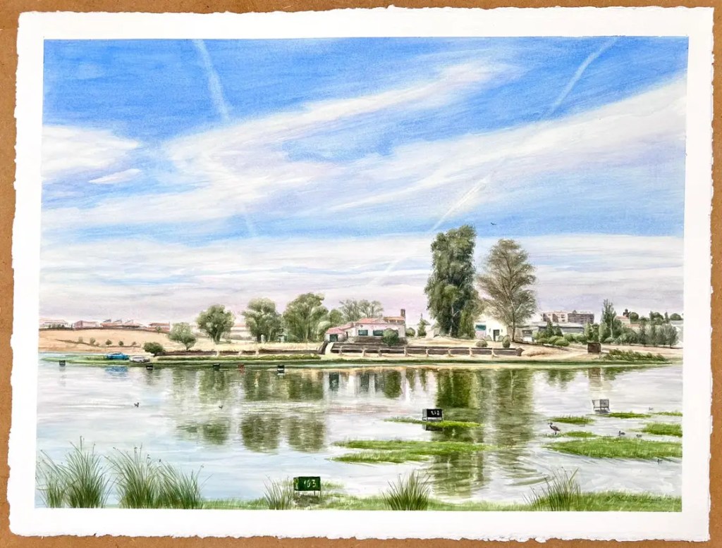 Charca de Brozas en plena ola de calor, a las 13:00 con 40º, eso sí, a la sombra de los eucalíptos que hay detrás de mí. La hice también por la mañana desde las 11.30 a 14:30 o incluso hasta las 15:00, de tamaño 56 x 76 cm.
