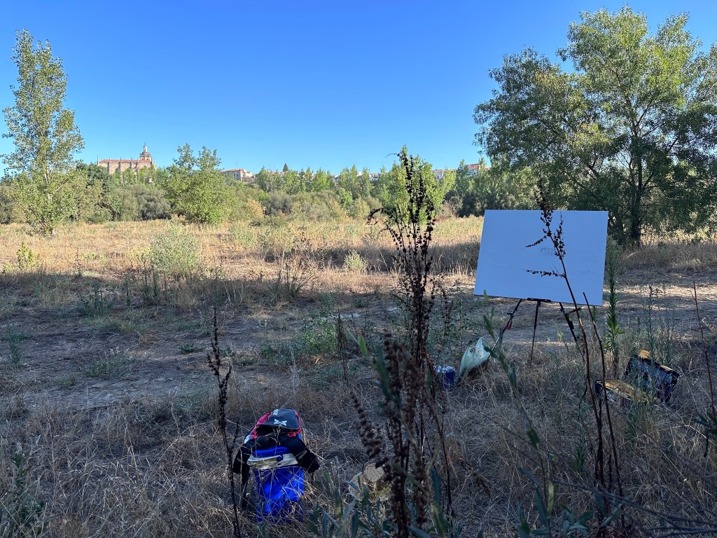 Participe con un óleo sobre lienzo de tamaño 100 x 65 cm, 40M. Me fui al medio del río Alagón para coger una perspectiva de tierra y arbolado con algún edificio de la ciudad de Coria. Utilicé un empaste grueso sin pinceladas de mucho detalle, un poco al estilo Sorolla. Como es habitual en verano, temperatura muy alta, sobre las 2 del medio día tuve que dejarlo por miedo a algún golpe de calor, recoger todo y vadear de nuevo el río. Me daban ganas de no participar y volver alguna que otra mañana para resolver un poco más el primer plano. Pero, así quedó.