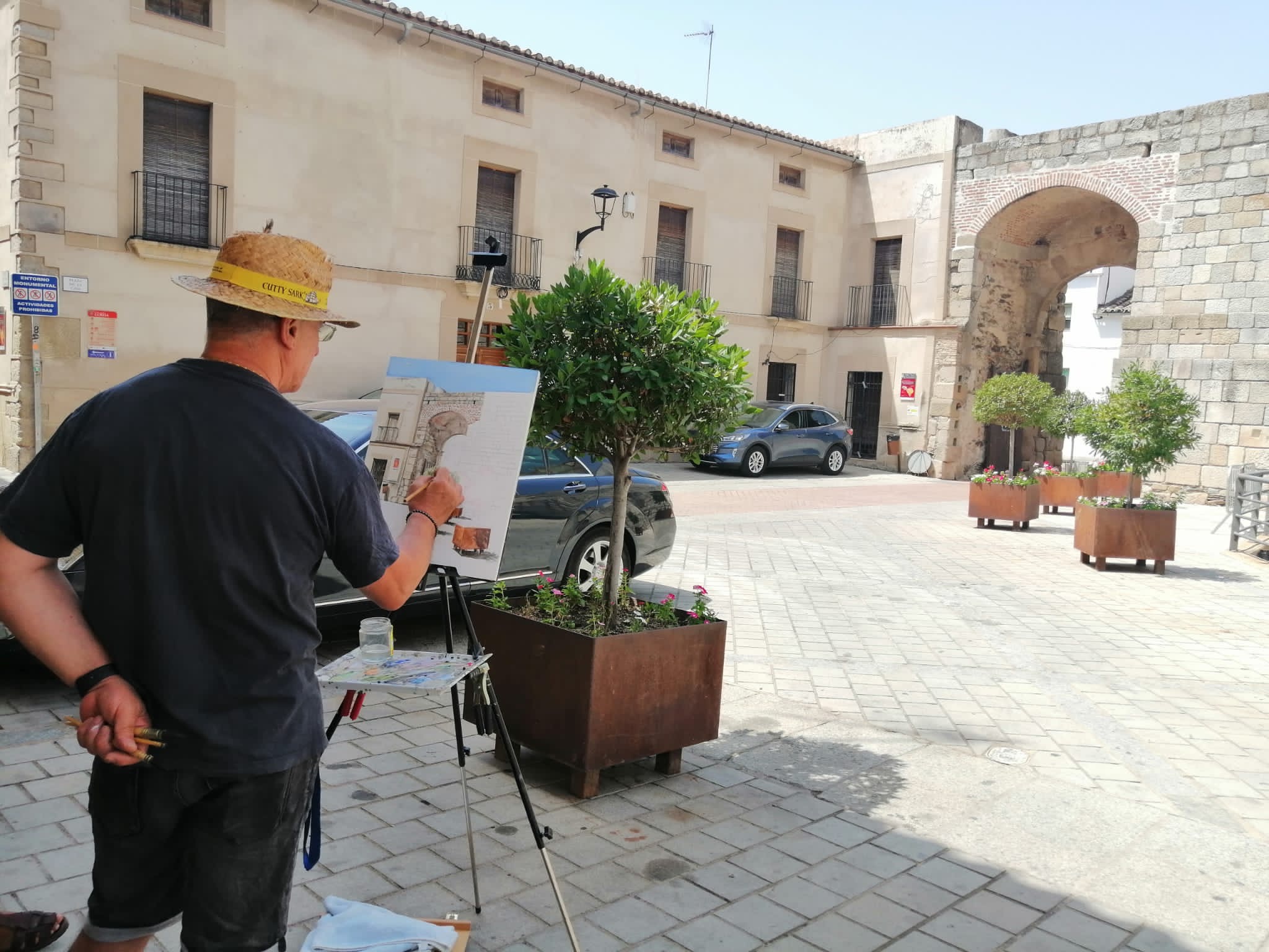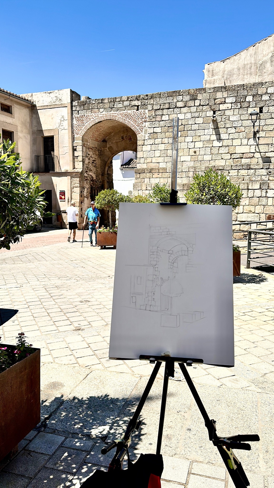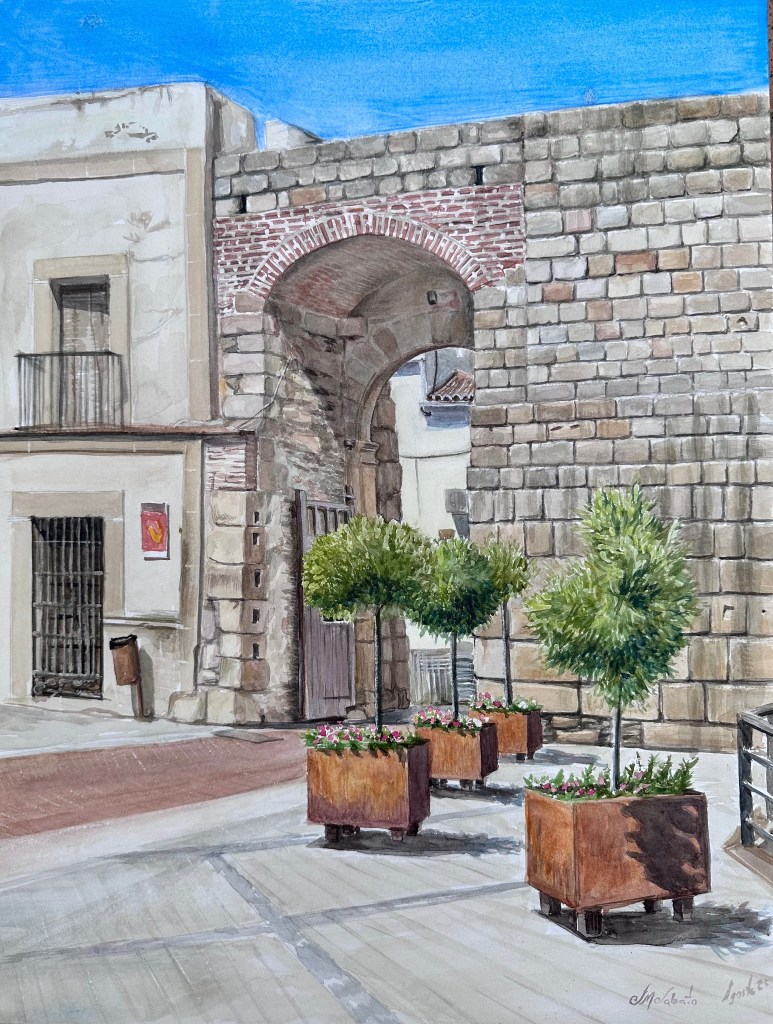 Tomando contacto con la acuarela en la plazuela de la cava de Coria. Aparecen la muralla y la portona del rollo, antiguamente de San Francisco.