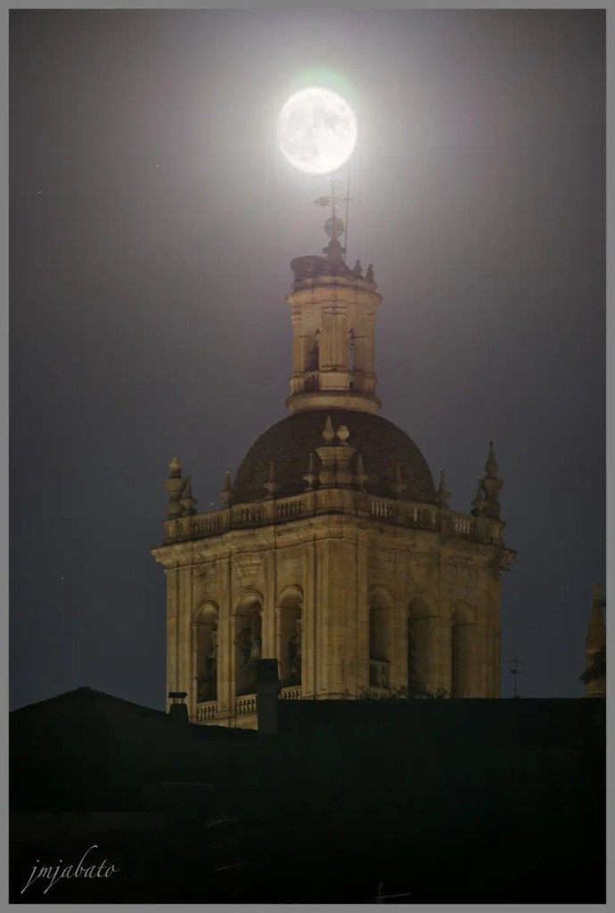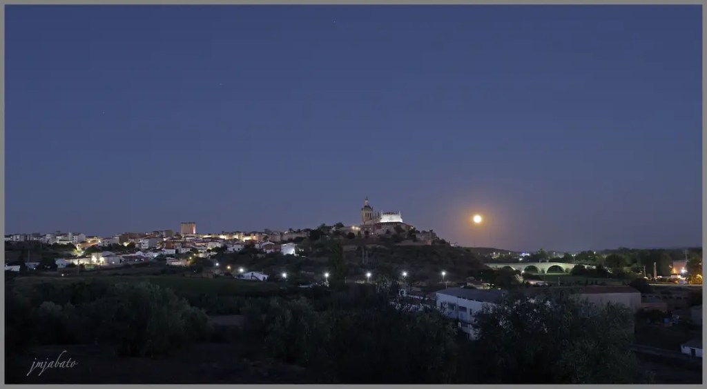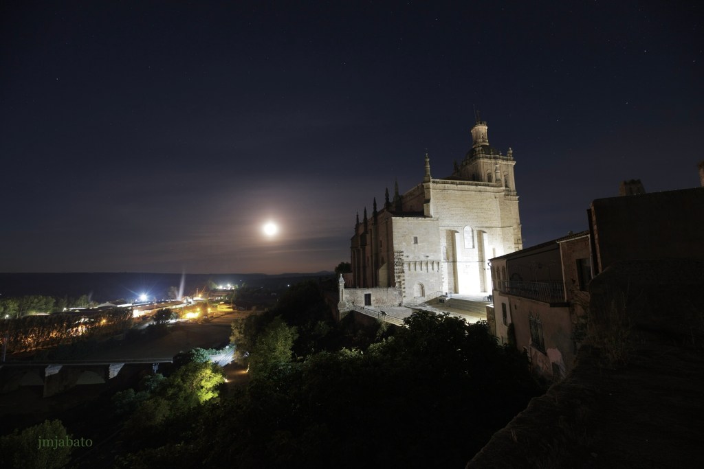 Vista con luna menguante, aunque no se aprecia, hacia el oeste cogiendo el puente de piedra y la bajada de la calzada y la catedral.