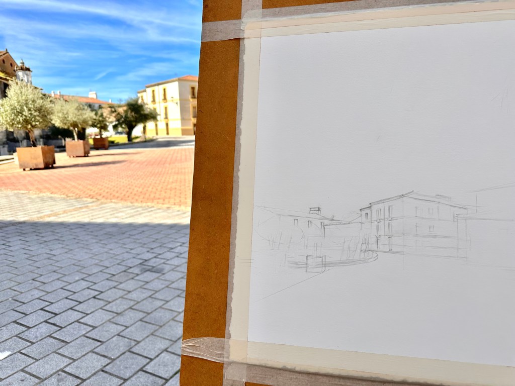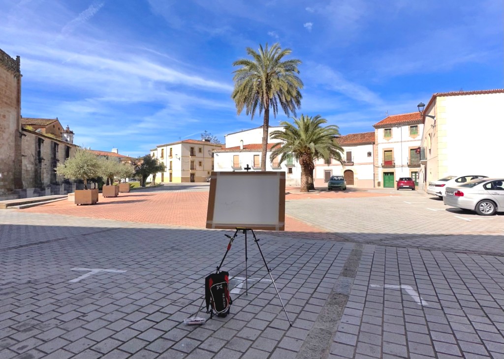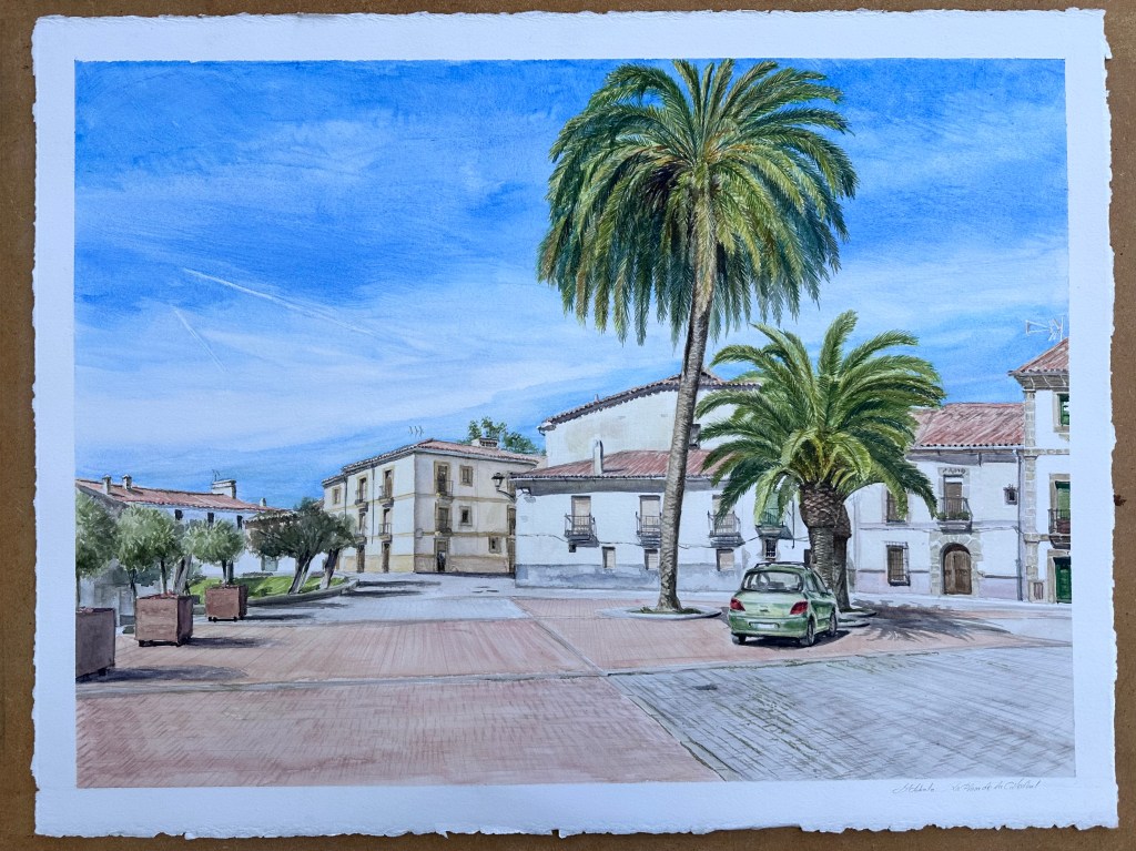 Por las mañanas en la plaza de la catedral de Coria. Intentando una acuarela sobre algodón y de medidas 76 x 57 cm.