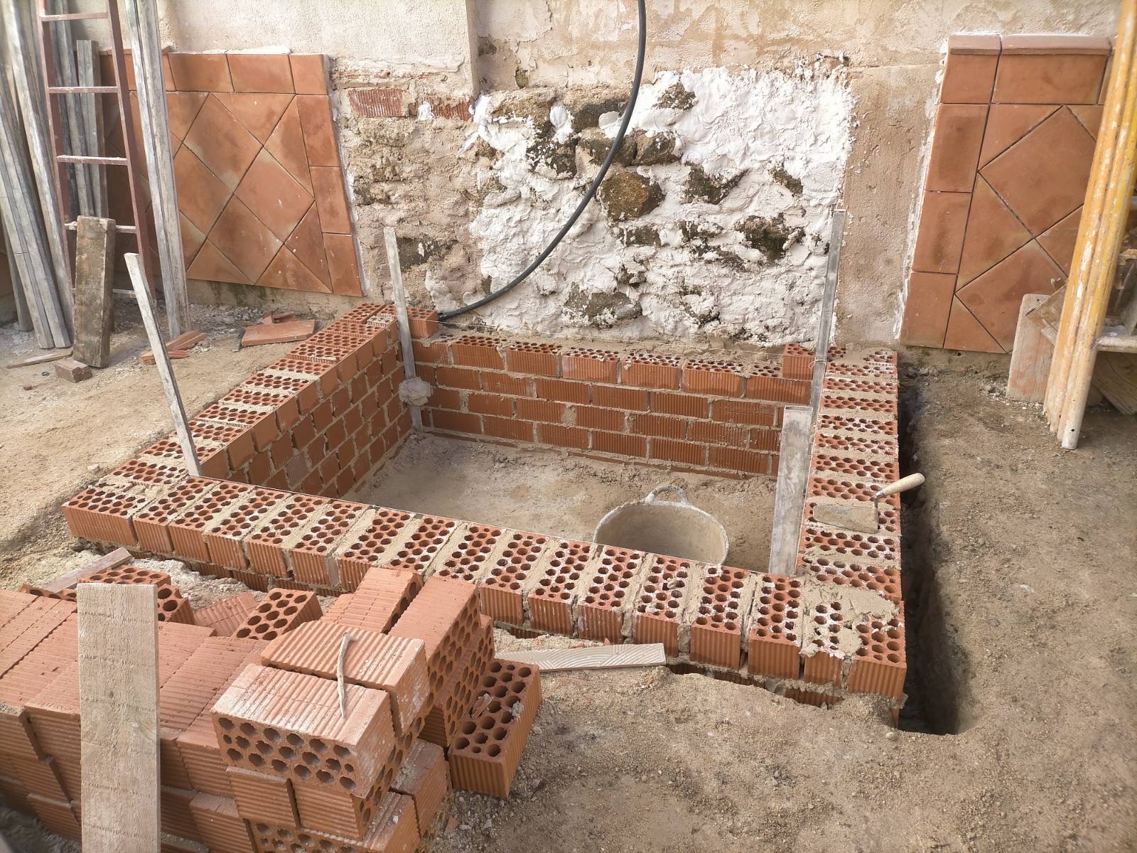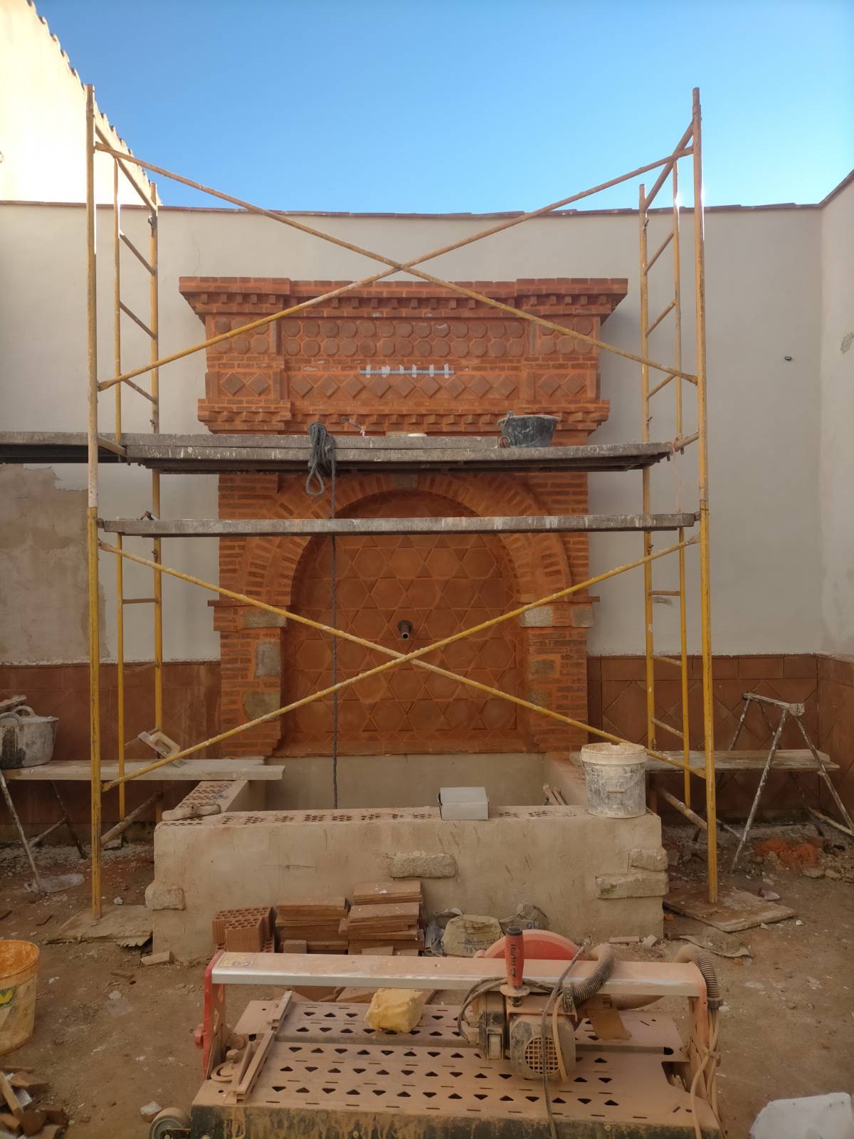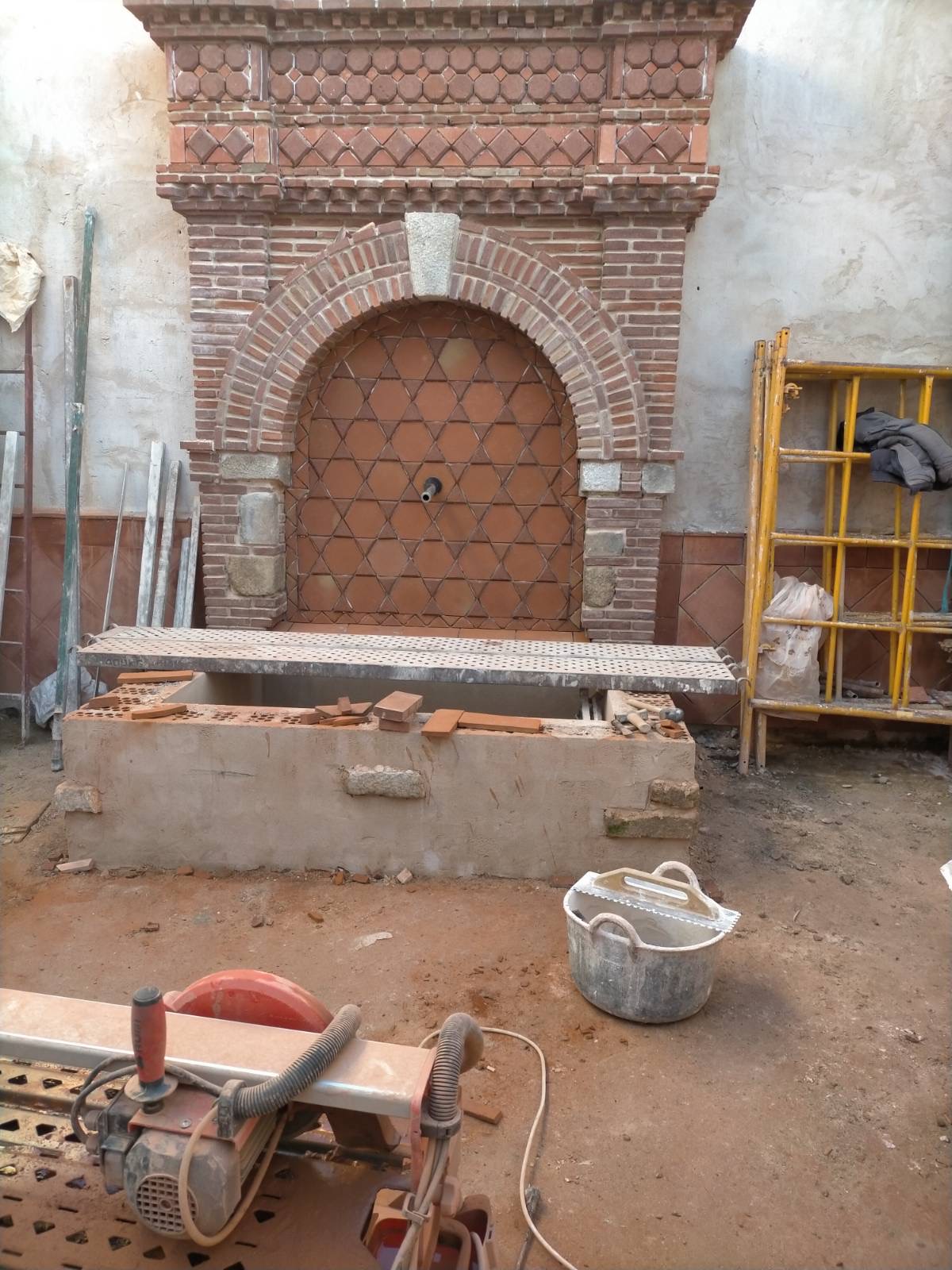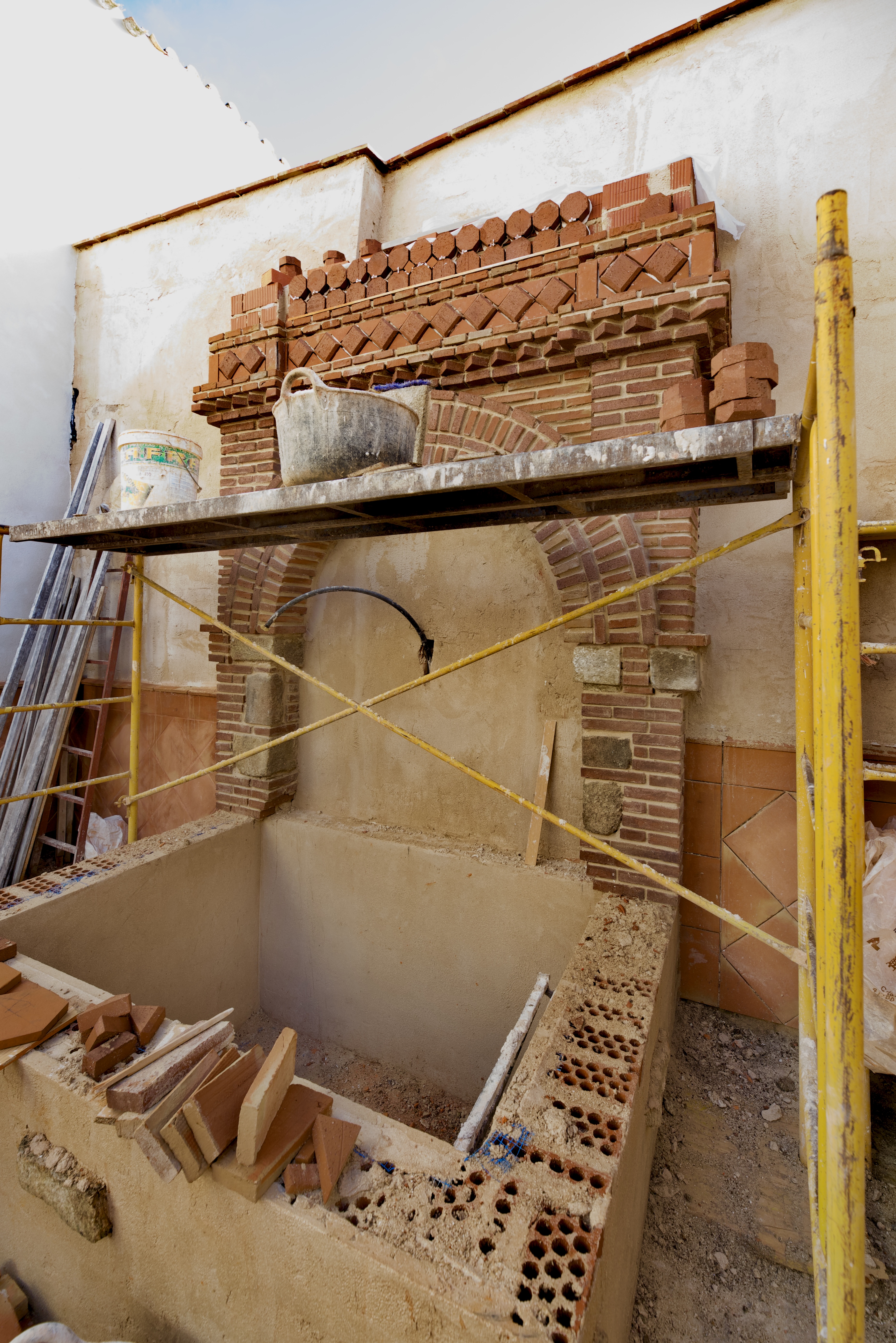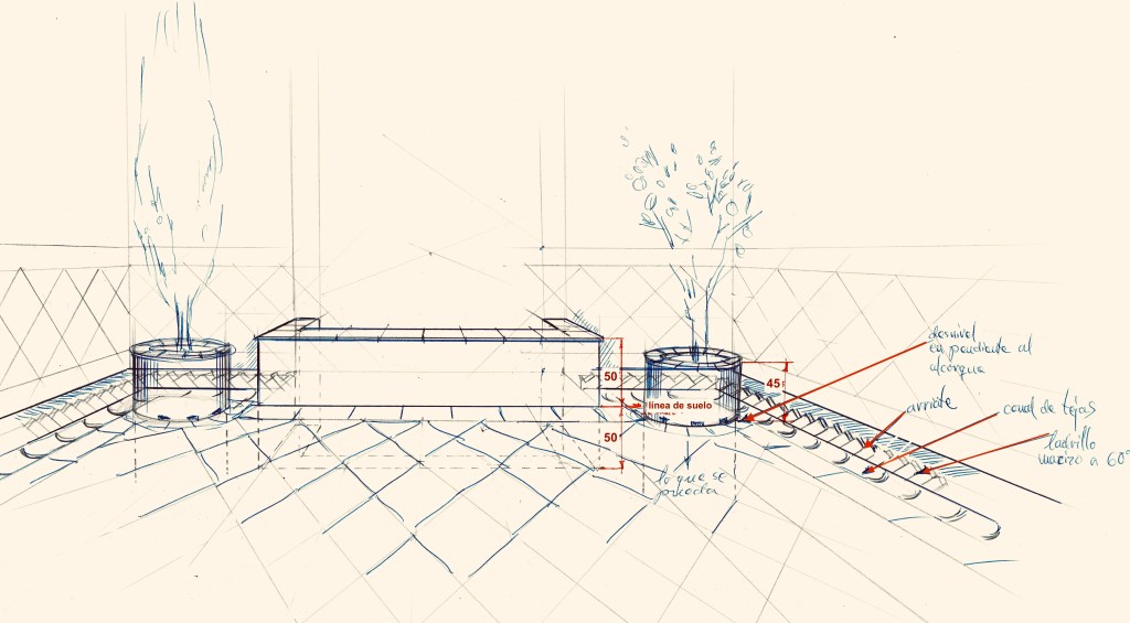 El propietario me hizo el encargo de diseñar una fuente con un pilón para baño veraniego. La distribución del agua debía de funcionar en circuito cerrado: se extrae el agua de un pozo que dispone la vivienda hasta la fuente, de ésta al estanque y, por dos rebosaderos y canales que bordean el patio, volver de nuevo al pozo. Quedó con un diseño de estilo romano-mozárabe, un rectángulo áureo con arco de medio punto.