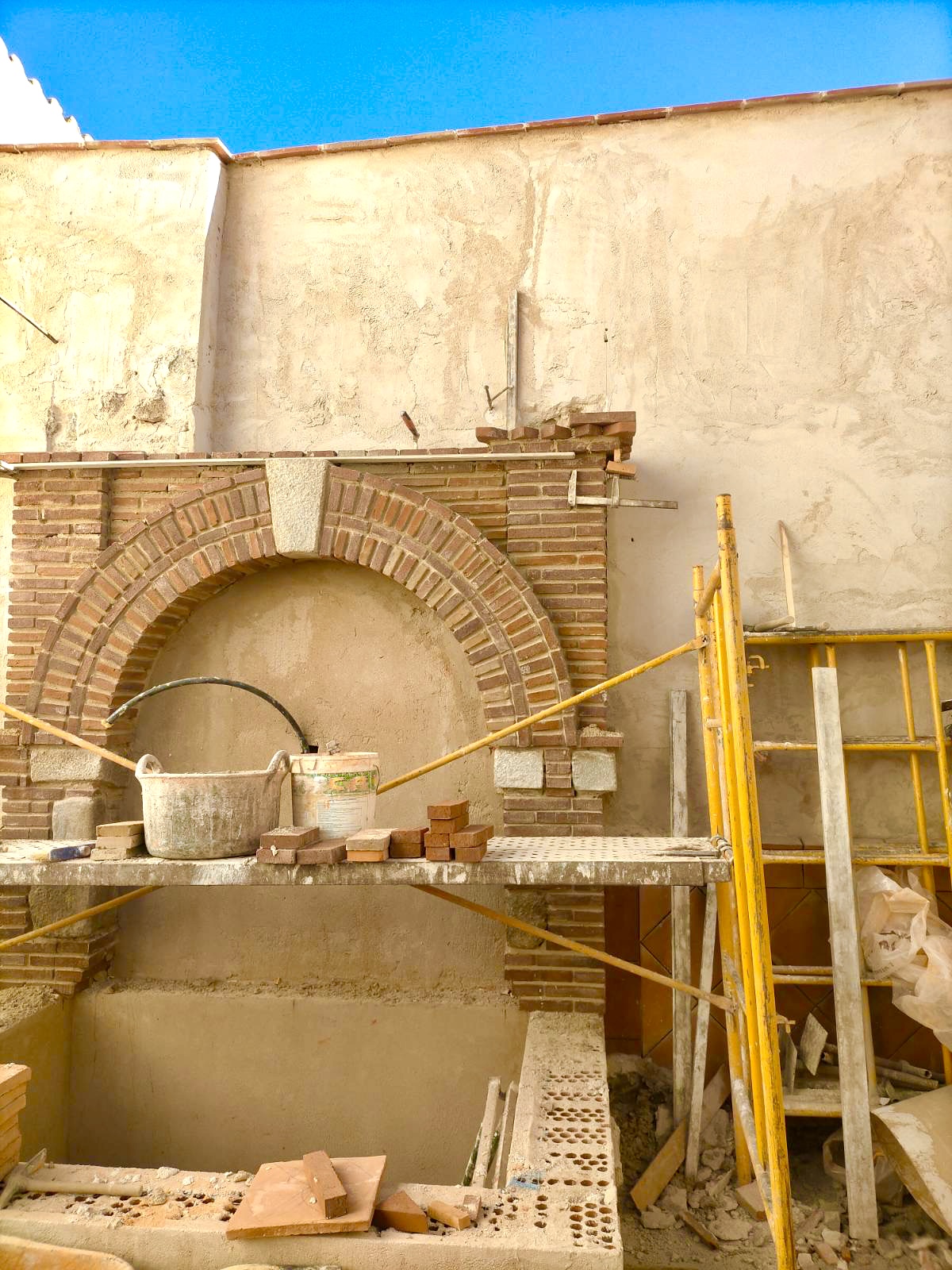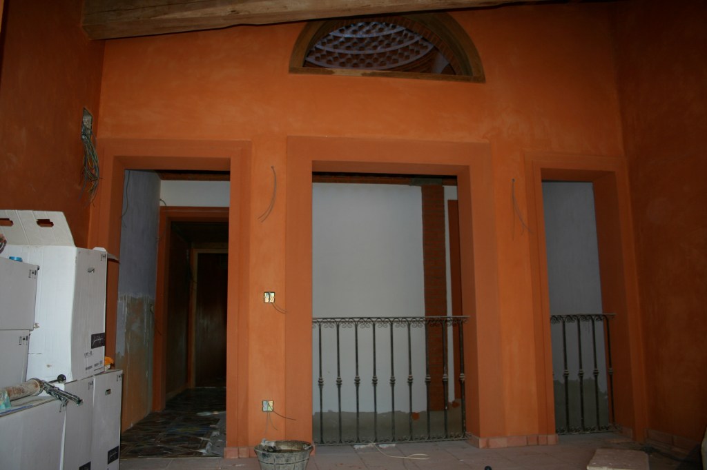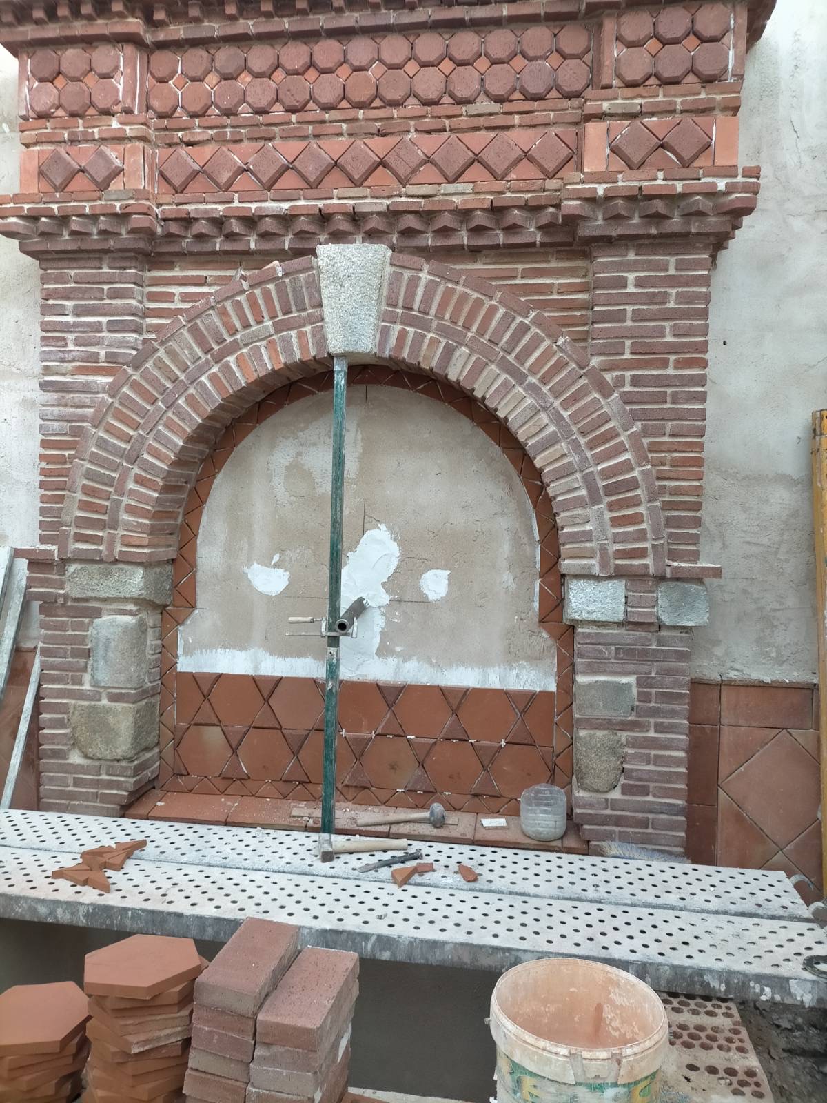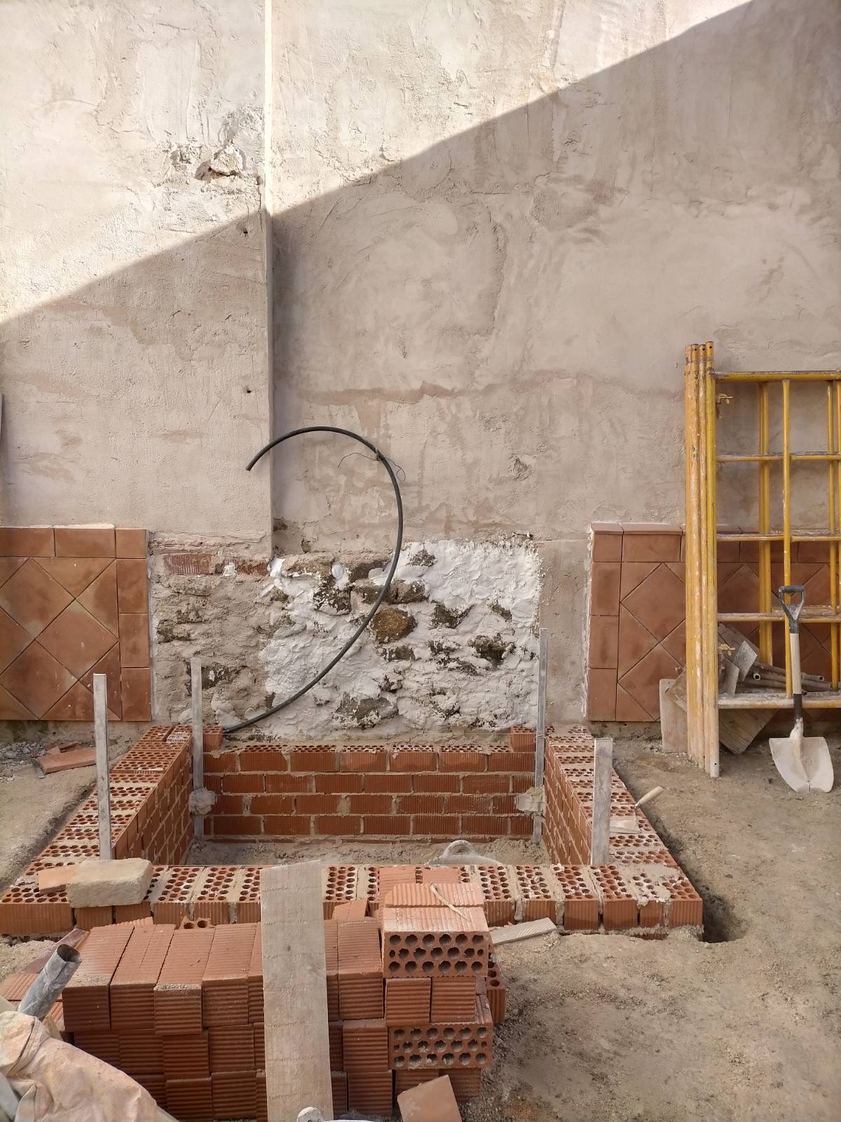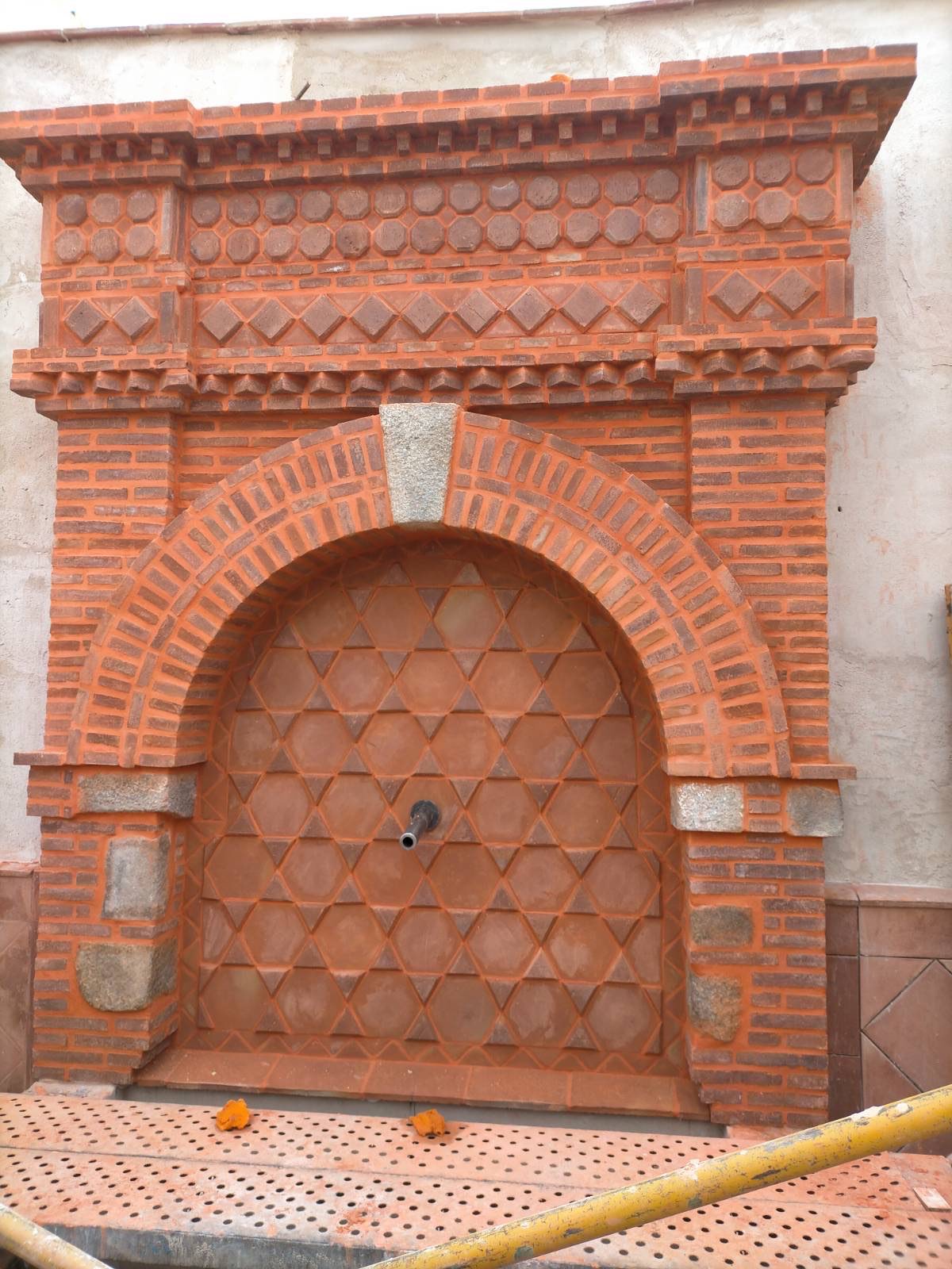 El propietario me hizo el encargo de diseñar una fuente con un pilón para baño veraniego. La distribución del agua debía de funcionar en circuito cerrado: se extrae el agua de un pozo que dispone la vivienda hasta la fuente, de ésta al estanque y, por dos rebosaderos y canales que bordean el patio, volver de nuevo al pozo. Quedó con un diseño de estilo romano-mozárabe, un rectángulo áureo con arco de medio punto.