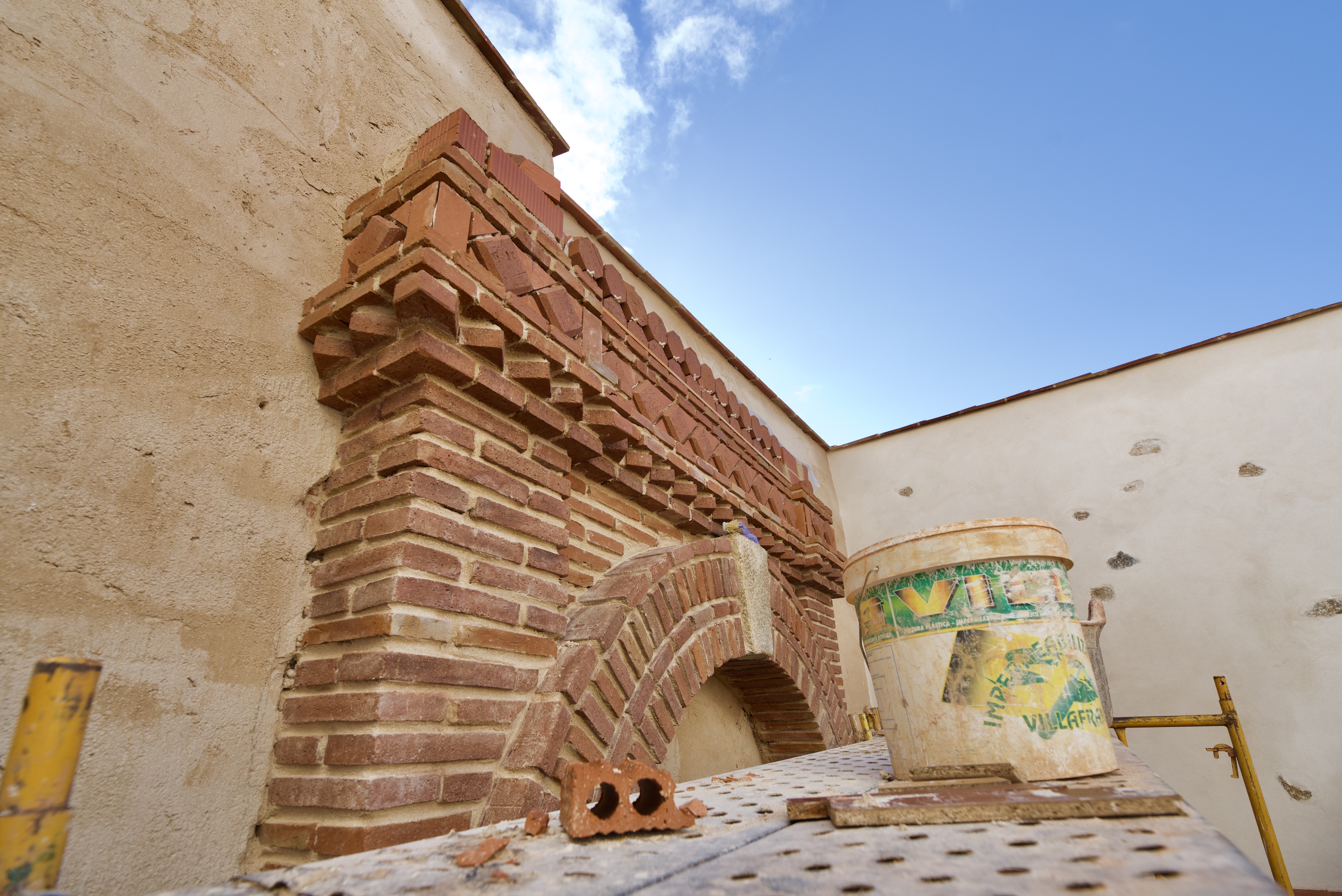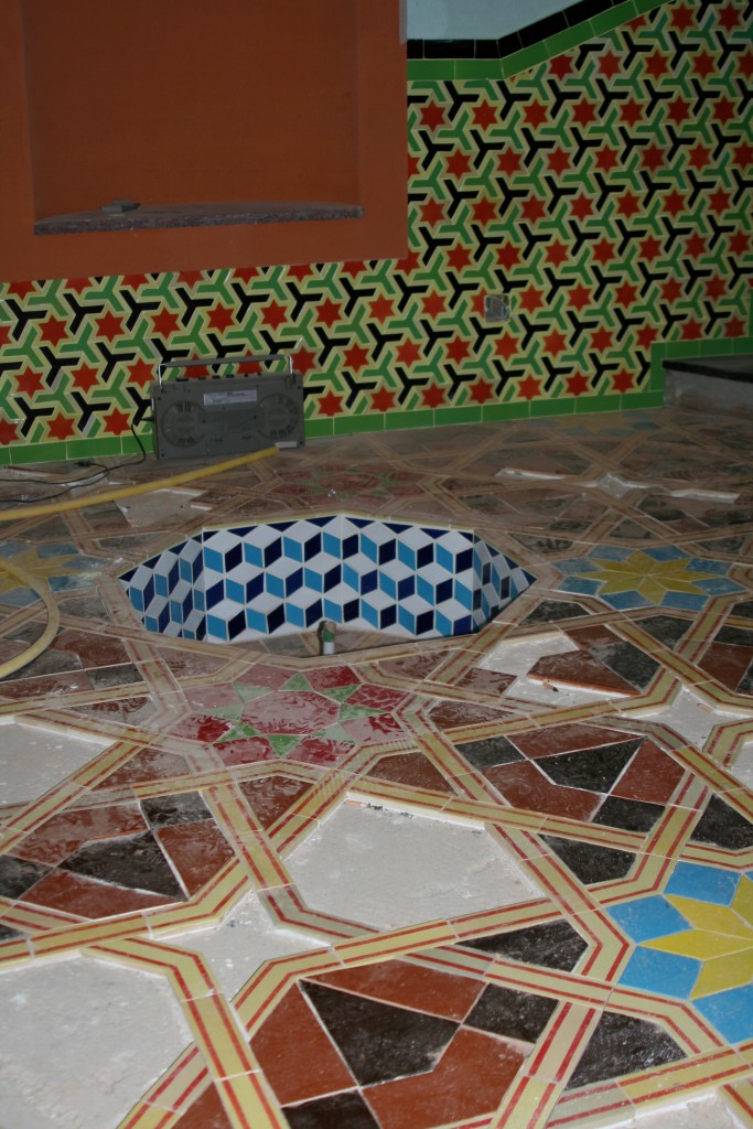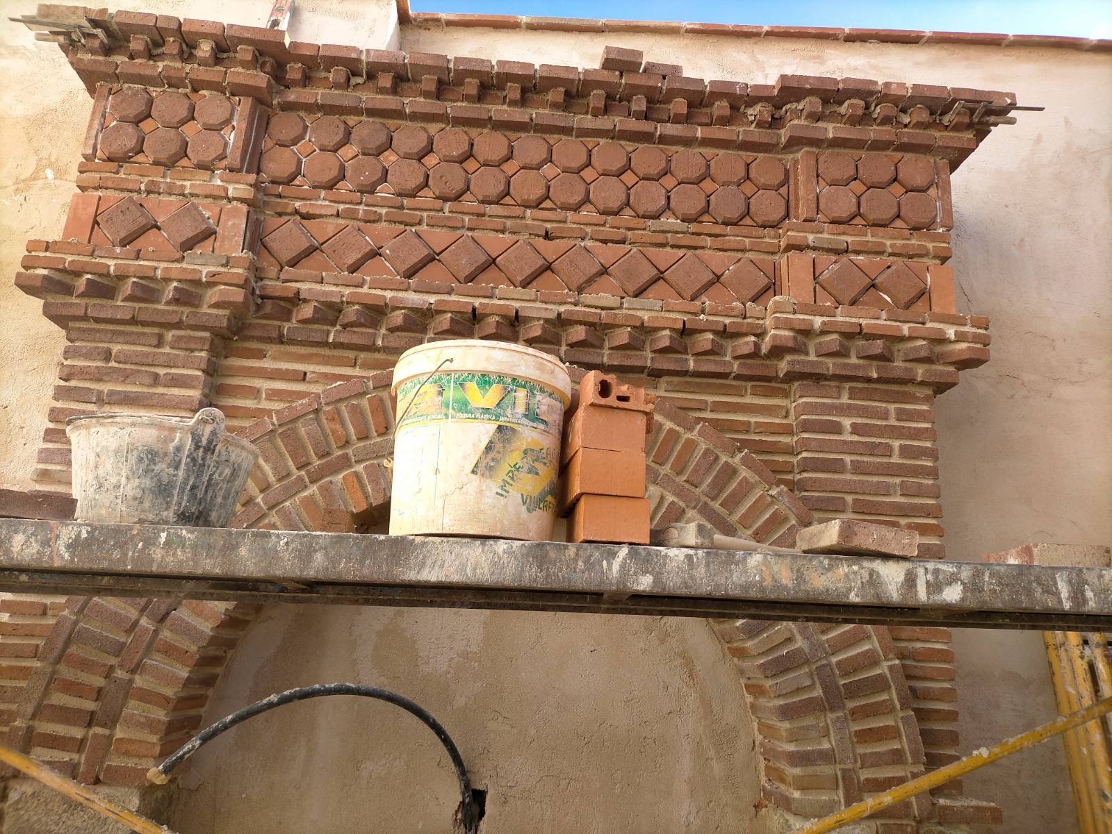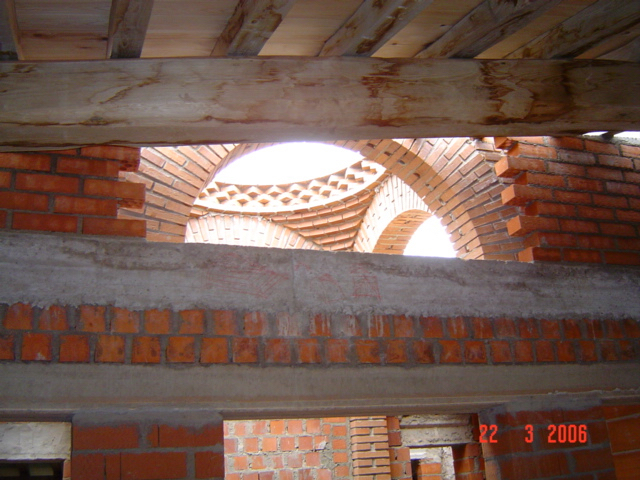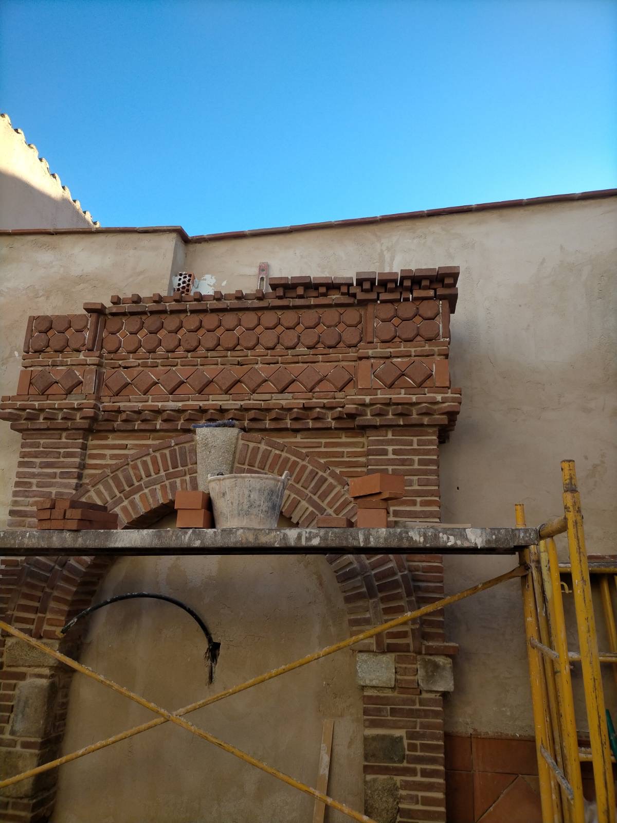 El propietario me hizo el encargo de diseñar una fuente con un pilón para baño veraniego. La distribución del agua debía de funcionar en circuito cerrado: se extrae el agua de un pozo que dispone la vivienda hasta la fuente, de ésta al estanque y, por dos rebosaderos y canales que bordean el patio, volver de nuevo al pozo. Quedó con un diseño de estilo romano-mozárabe, un rectángulo áureo con arco de medio punto.