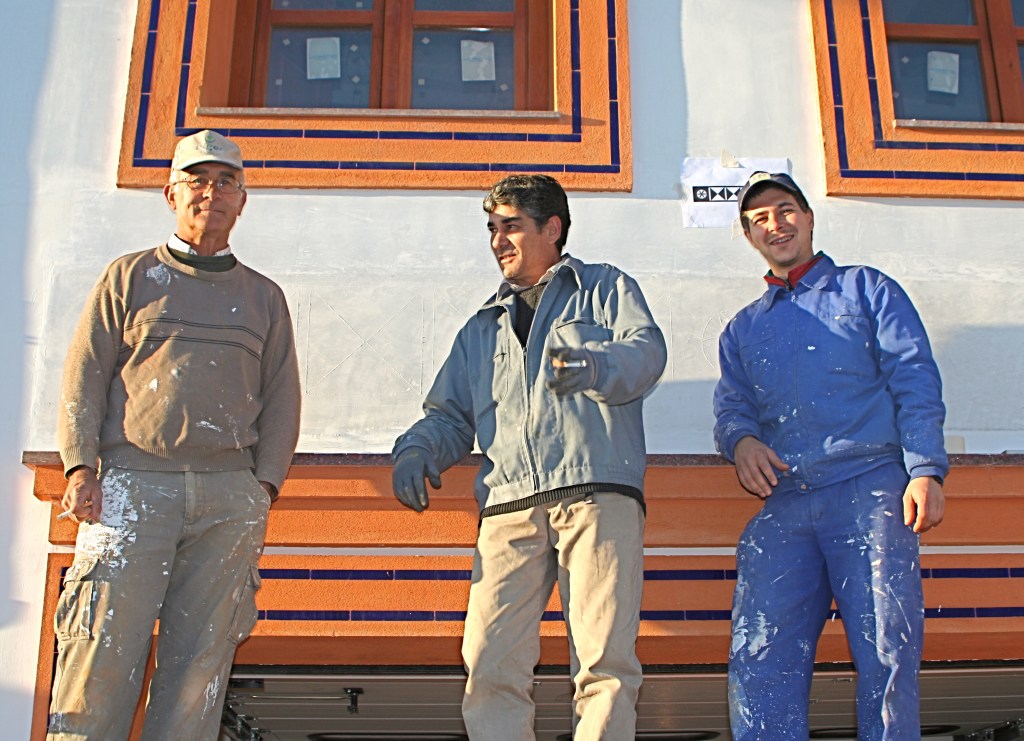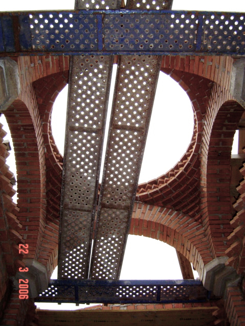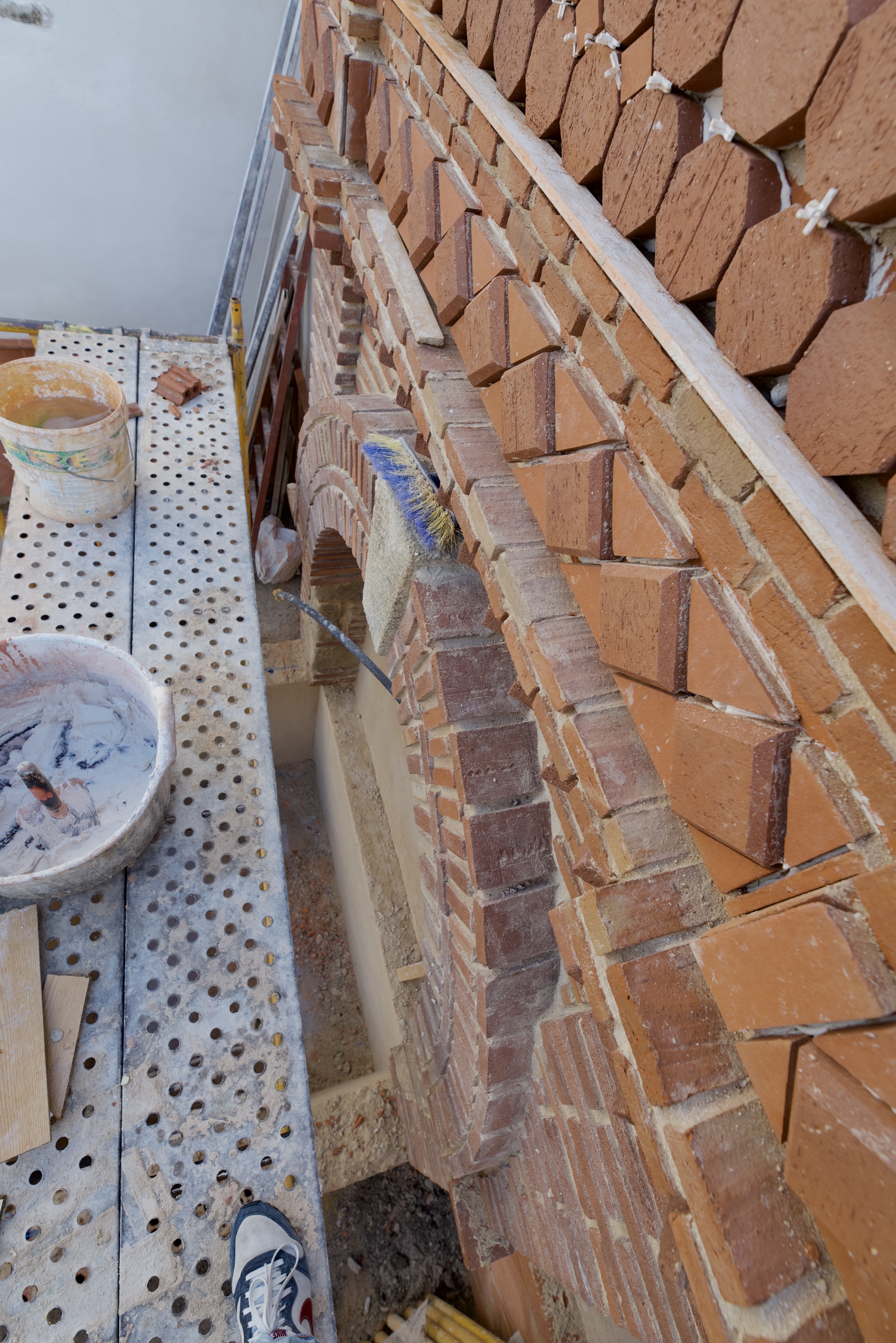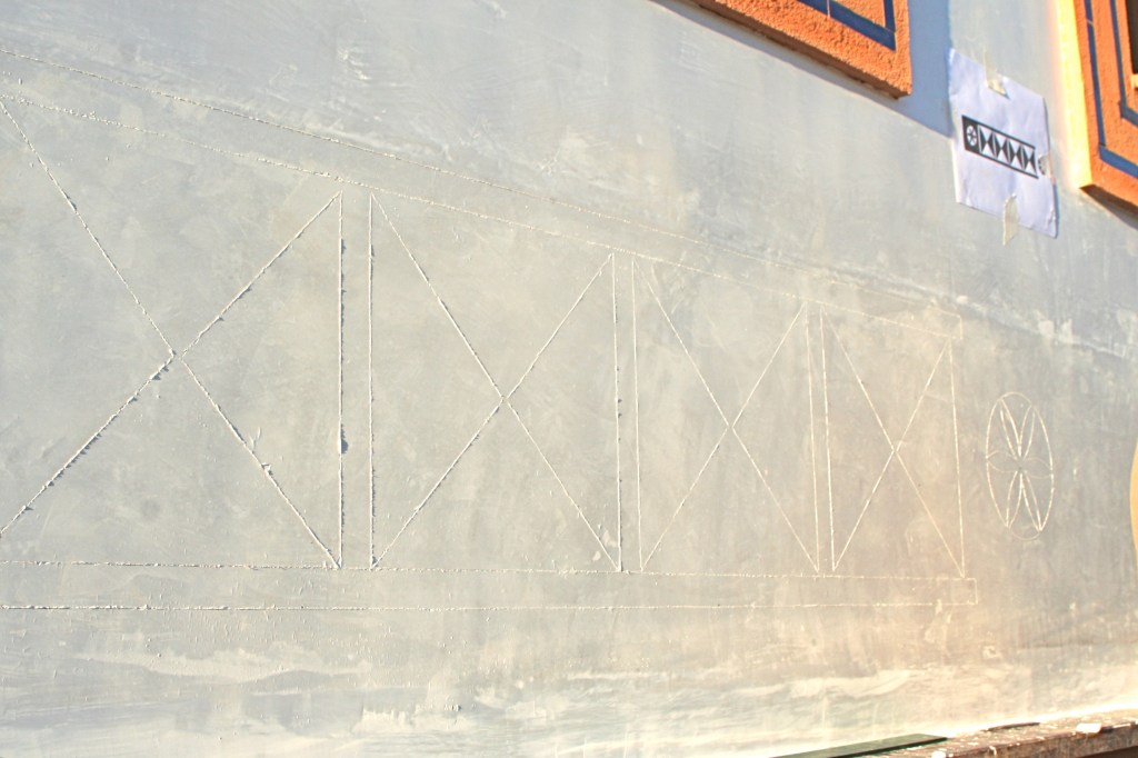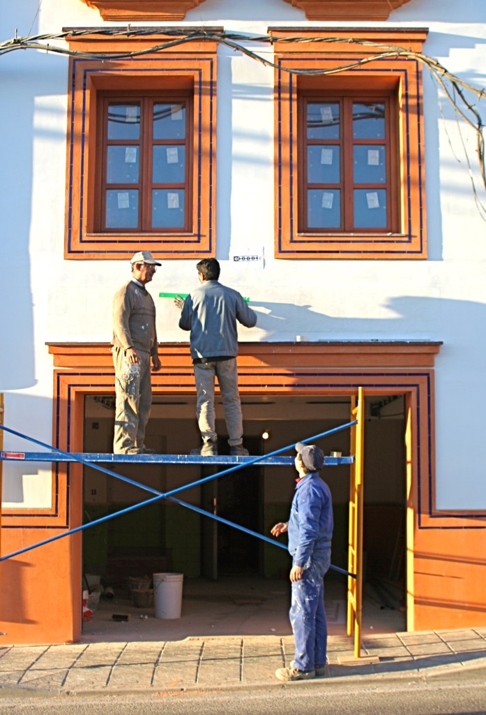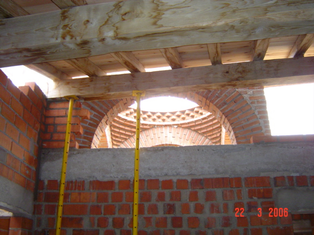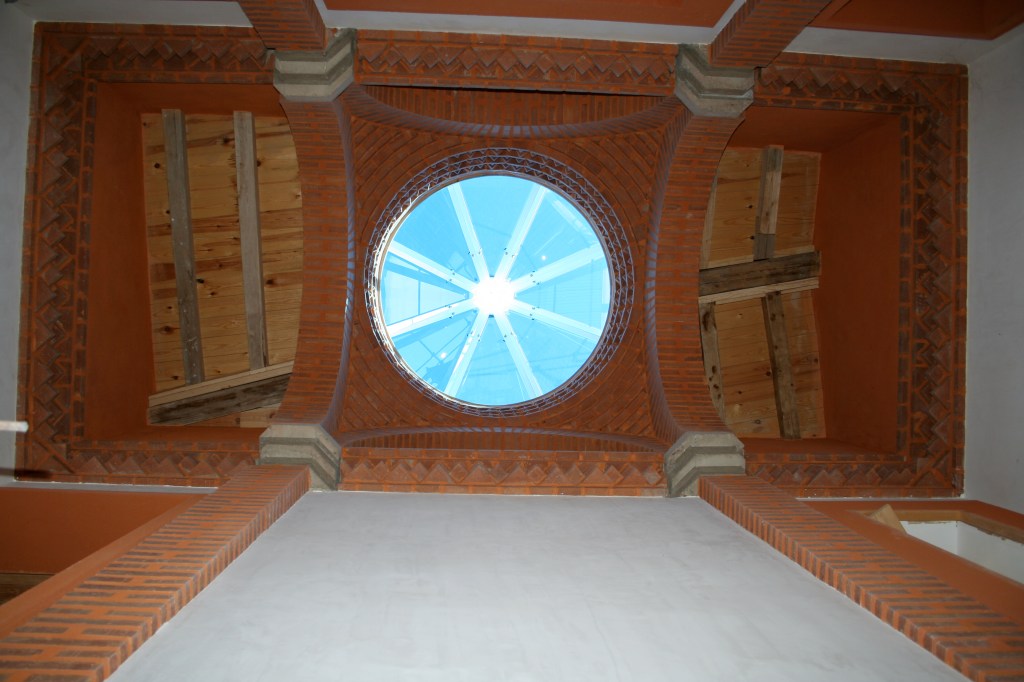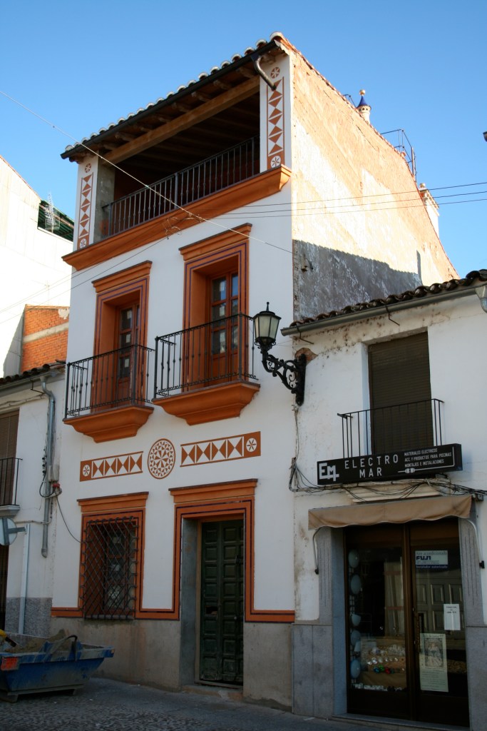 El propietario me hizo el encargo de diseñar una fuente con un pilón para baño veraniego. La distribución del agua debía de funcionar en circuito cerrado: se extrae el agua de un pozo que dispone la vivienda hasta la fuente, de ésta al estanque y, por dos rebosaderos y canales que bordean el patio, volver de nuevo al pozo. Quedó con un diseño de estilo romano-mozárabe, un rectángulo áureo con arco de medio punto.